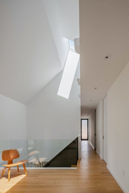 RG: In contrast to the open, horizontal orientation of the ground floor, the upper level is oriented vertically toward the sky and heavily compartmentalized with four bedrooms, three bathrooms, a study, and a family room. Spaces are compact but feel spacious thanks to the soaring vaulted ceilings and daylighting from skylights.