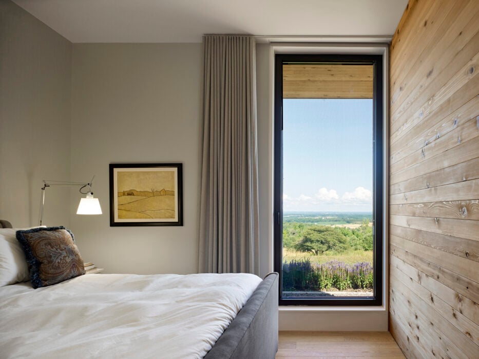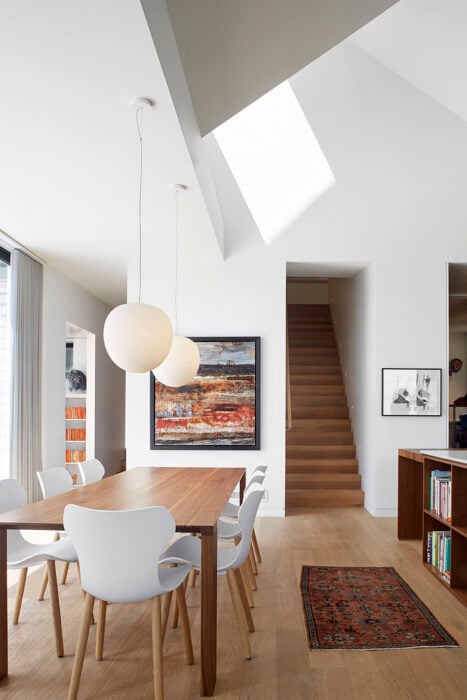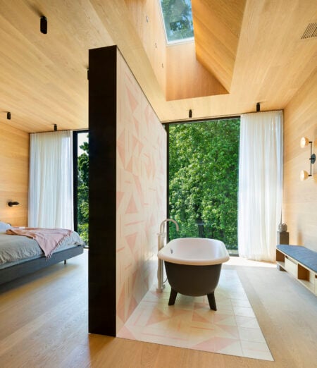 In an addition in midtown, for instance, the floor, walls and ceiling are wrapped in warm oiled white oak – a streamlined refuge defined by a faceted skylight, a bathtub hidden coyly behind a half wall, and a fearlessly oversized window looking out to a green canopy. Simplicity in materials draws the eye toward these architectural moments. “Whether it’s clad in barn board or laser-cut Egyptian marble, it shouldn’t matter,” Graham says. “The actual essence of the space will be the same.”