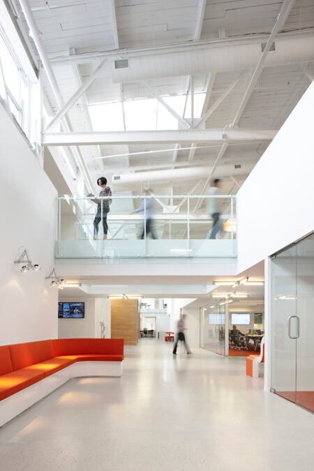 Employing urban planning strategies (and Guy Debord and the Situationists’ concept of psychogeographic mapping), indoor streets, bridges and bleachers consign each agency to its own “neighbourhood.” The firms are united by a series of hospitality-inspired common spaces co-designed with Mazen Studio, including a café–bar and an indoor basketball court.