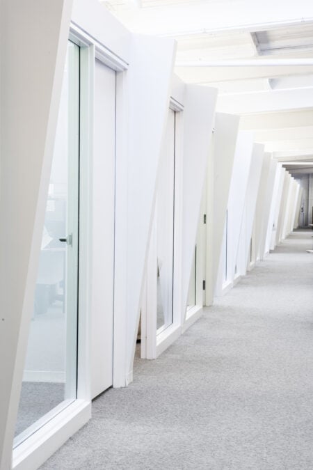 Architecturally speaking, it’s not easy to make an empty warehouse feel polished or cultured or built for a multi-faceted community, but this is perhaps among L&B’s greatest strengths as a firm. Leveraging the same placemaking approaches as it did for OneMethod, L&B transformed a former fish factory into a home for the much buzzed-about Sidewalk Labs, the avante-garde headquarters where Google’s parent company Alphabet is working with Waterfront Toronto to reimagine a strip of the lakeshore in the East End. Upon entry, a dramatic volume reminiscent of a ship’s hull mediates office and group areas. Meanwhile, a raised floor treatment of hexagonal plywood ushers visitors into an open community space.