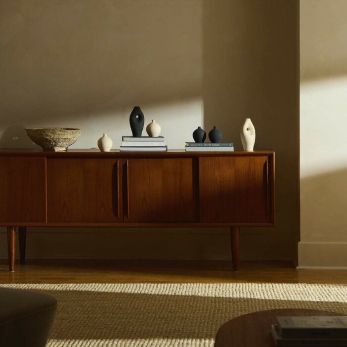 Solem Ceramics’ signature works are typically glazed in cobalt blue. For this collaboration, the team chose to stick with Silk & Snow’s cream and black aesthetic, sourcing recycled clay that naturally match the Pantones. The design team and Solem Ceramics worked through a few iterations of vases, focusing on finding designs that felt natural to the bedroom and complemented the existing product line—settling on the two designs as they work in a pair, but are also striking on their own.