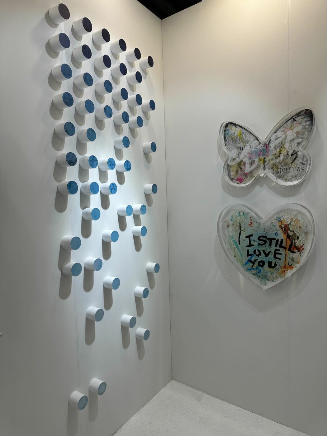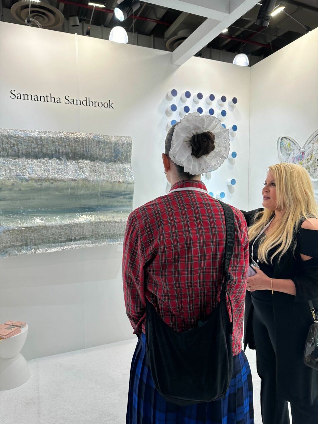 As I sashay—Carrie Bradshaw-style—through the ICFF 2024 showroom, my next Torontonian encounter is with artist and interior designer Samantha Sandbrook. Original artworks in shades of seafoam and cornflower blue hang on the walls, rife with hidden messages: ‘Beware the Dogs’ for one, referring to the Hollywood casting couch. Playfully blending her distinctive contemporary art style with years of interior design experience, Sandbrook plays with high contrast colours and raw industrial materials.